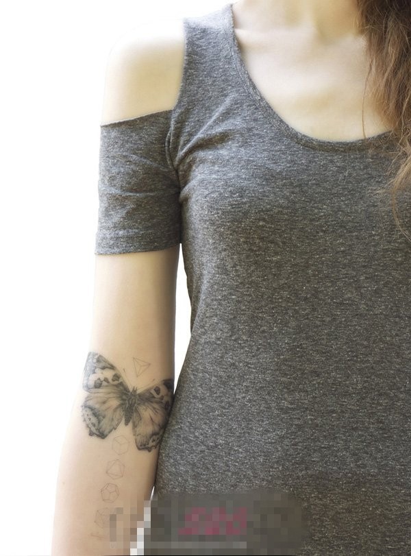 女生手臂上黑灰点刺简单线条小动物蝴蝶纹身图片