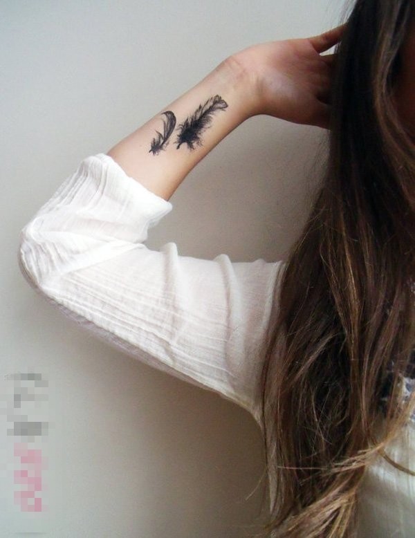 女生手腕上黑色点刺轻盈羽毛纹身图片