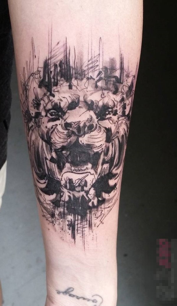 女生手臂上黑灰点刺抽象线条小动物狮子纹身图片