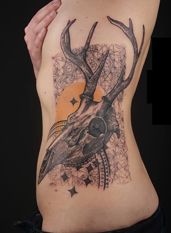 女生侧腰上黑灰素描创意霸气羊头纹身图案