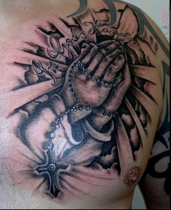 男生胸口上黑色素描点刺技巧创意十字架项链纹身图片