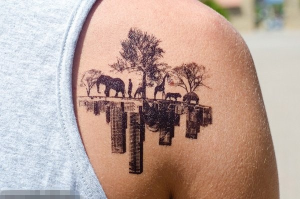 男生肩部黑色点刺建筑和动物植物纹身图片