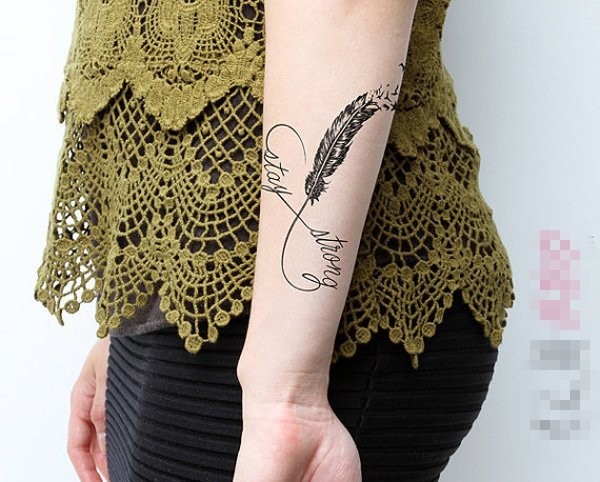 女生手臂上黑色无限大符号英文单词和羽毛纹身图片