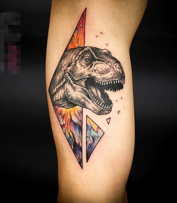 女生小腿上黑色素描彩绘菱形恐龙纹身图片