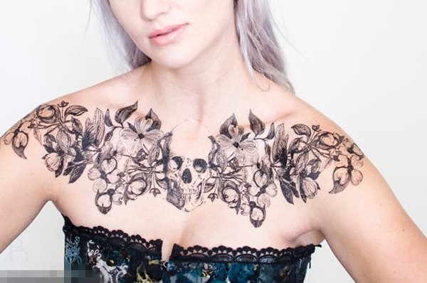女生锁骨下黑色素描创意唯美花朵骷髅纹身图片
