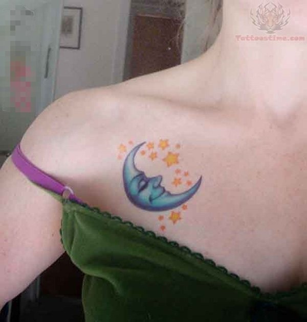 女生锁骨上彩绘月亮与星星清新纹身图片