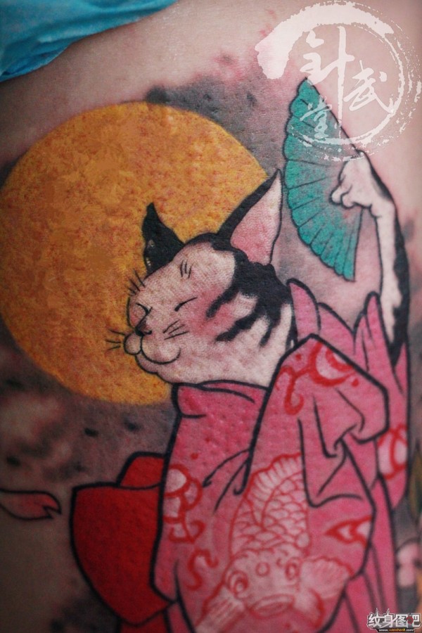 针武堂刺青(郑州) 猫樱花扇子 大腿