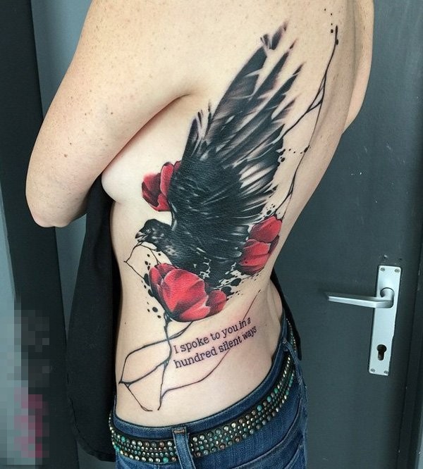 女生侧腰上彩绘文艺花朵和小动物鸟纹身图片