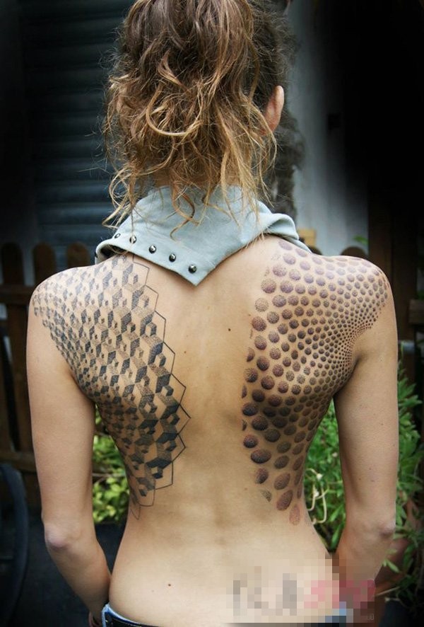 女生背部黑色素描点刺技巧创意花纹对称纹身图片