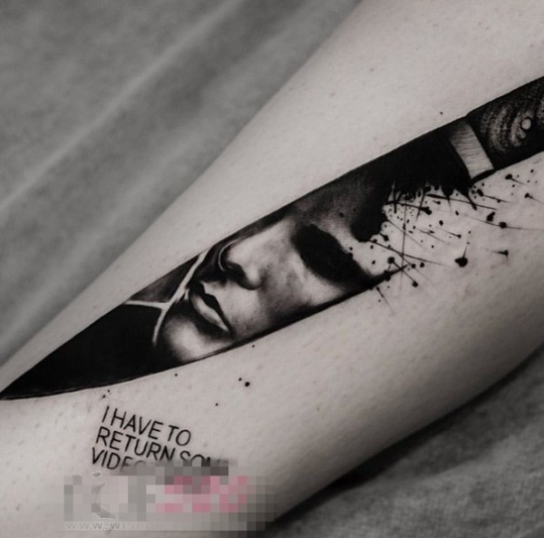 男生小腿上黑色点刺人物肖像匕首纹身图片