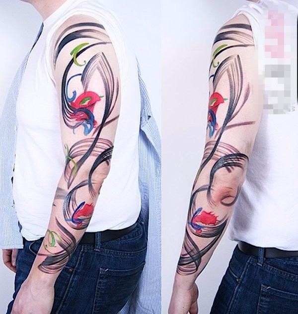 男生手臂上彩绘水彩创意花纹花臂纹身图片