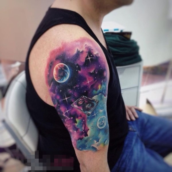 男生手臂上彩绘渐变星空元素几何星球宇宙纹身图片