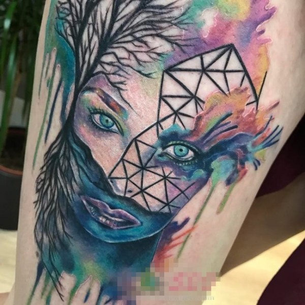 男生手臂上彩绘水彩泼墨女生人像几何元素抽象纹身图片