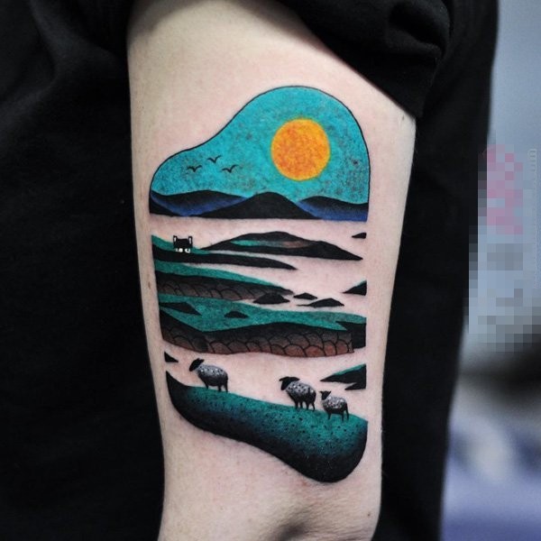 女生手臂上彩绘水彩创意落日风景纹身图片