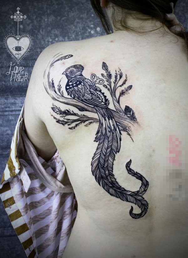 女生后背上黑灰点刺树枝和小动物鸟纹身图片