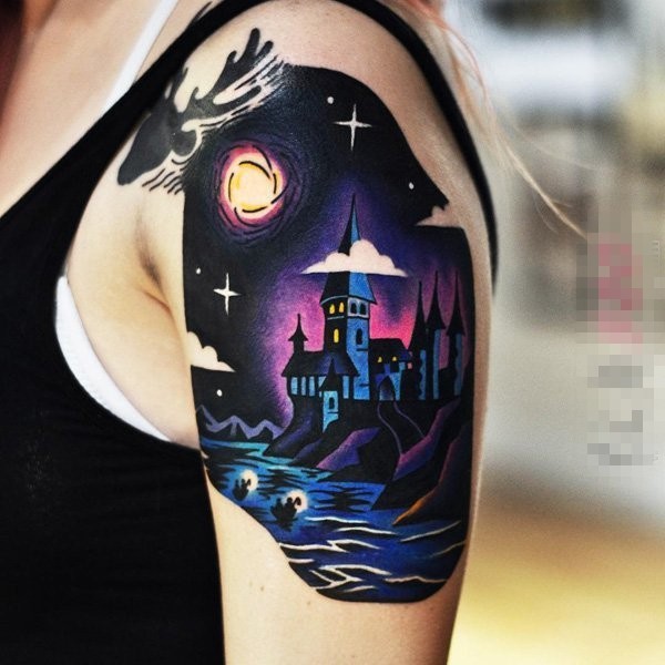 女生手臂上彩绘水彩创意唯美夜景纹身图片