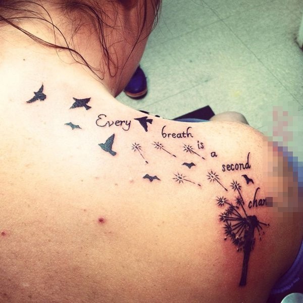 女生肩部黑色小鸟轮廓和植物蒲公英纹身图片