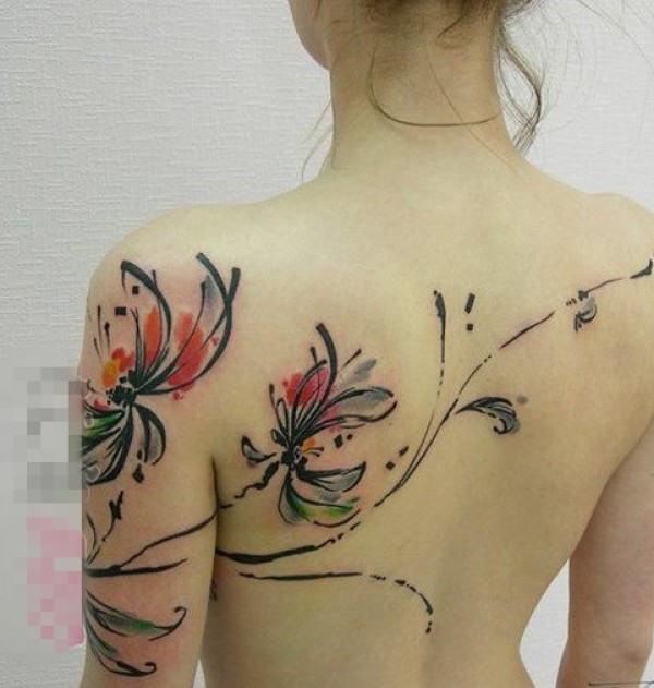 女生后背上彩绘泼墨抽象线条植物花朵纹身图片
