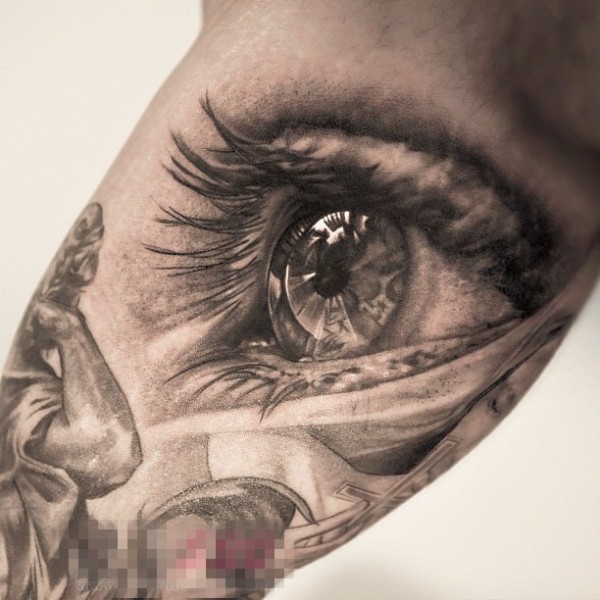 女生手臂上黑灰素描创意唯美精致眼睛纹身图片