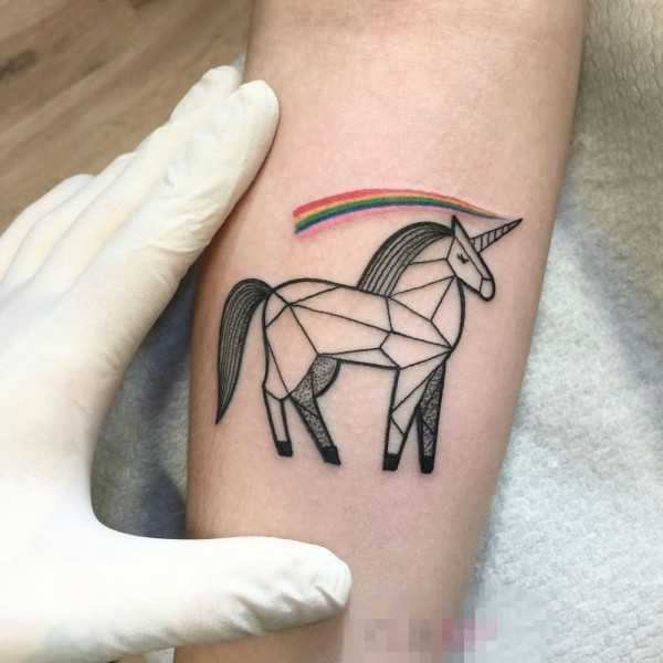 女生手臂上彩绘彩虹和几何线条独角兽纹身图片