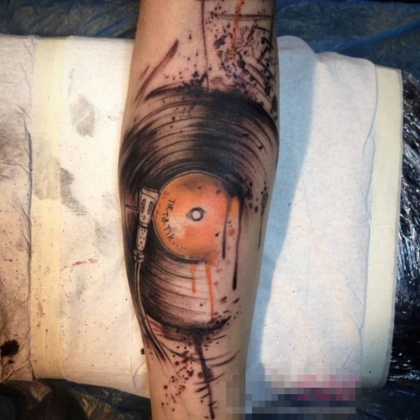 男生手臂上彩绘点刺简单线条创意唱片纹身图片
