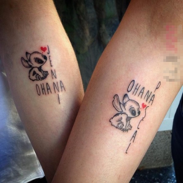 情侣手臂上黑色线条素描创意卡通史迪仔纹身图片