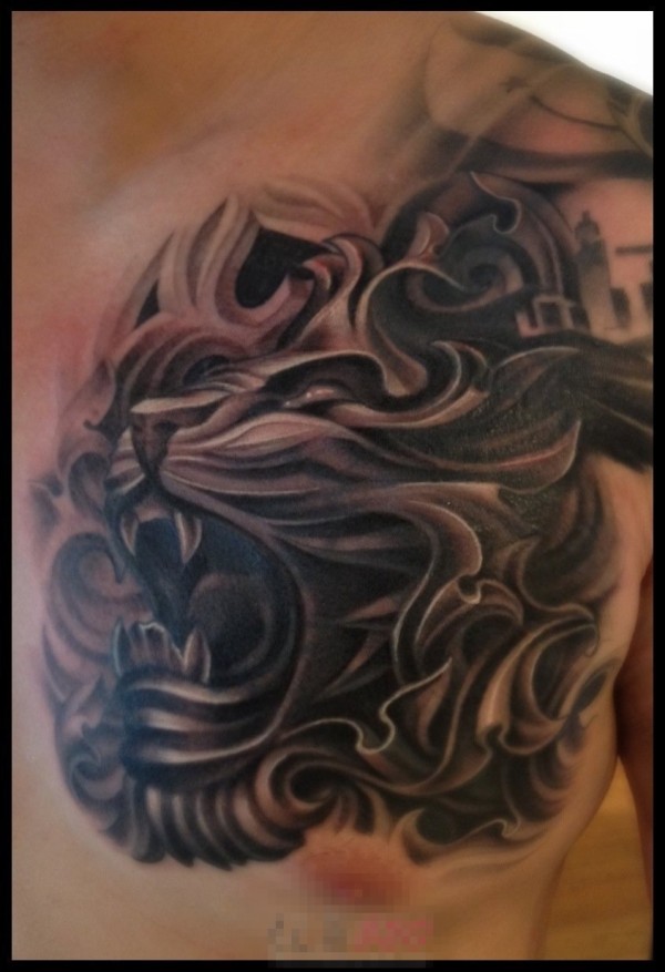 男生胸口上黑灰素描点刺技巧霸气狮子头纹身图片