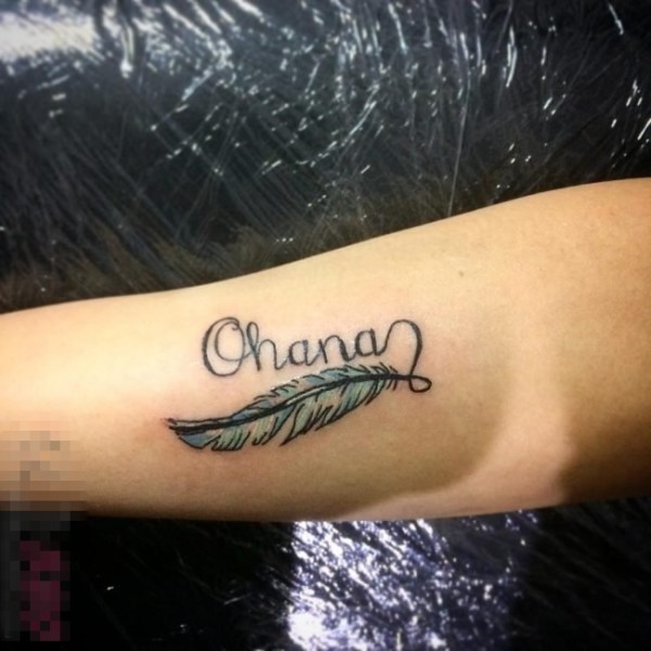 男生手臂上彩绘技巧英文单词和柔软羽毛纹身图片