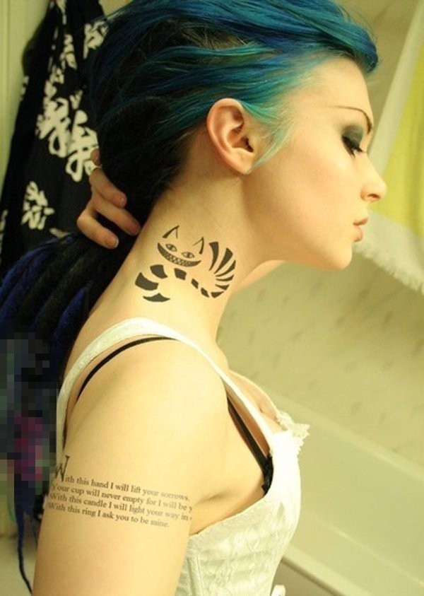 女生脖子上黑色线条创意可爱猫咪纹身图片