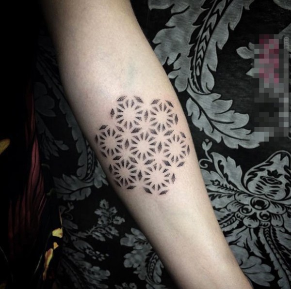 女生手臂上黑色点刺几何图形植物花朵纹身图片