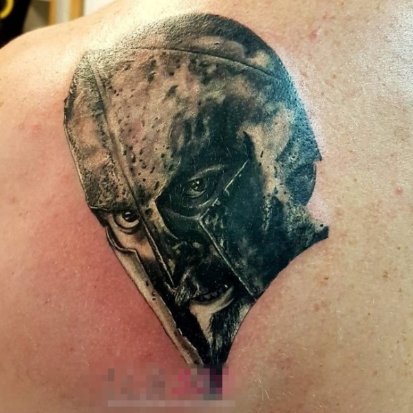 男生背部黑灰素描点刺技巧创意斯巴达纹身图片