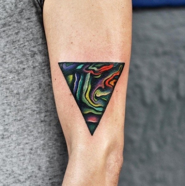 男生手臂上彩绘渐变几何线条三角形纹身图片