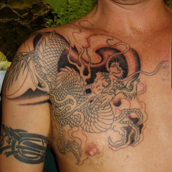 男生胸口上黑色线条素描霸气龙图腾纹身图片