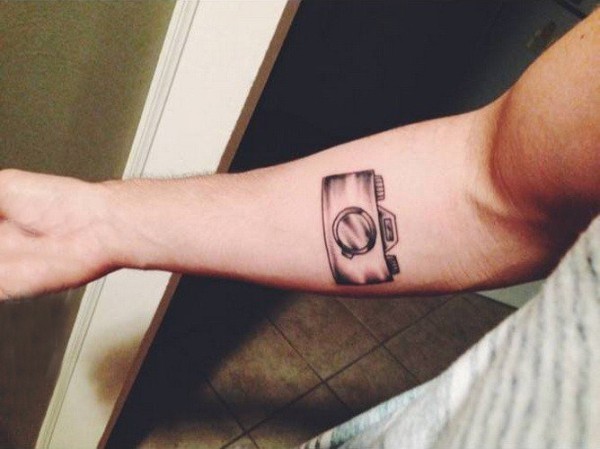 女生手臂上黑灰素描点刺技巧创意相机纹身图片