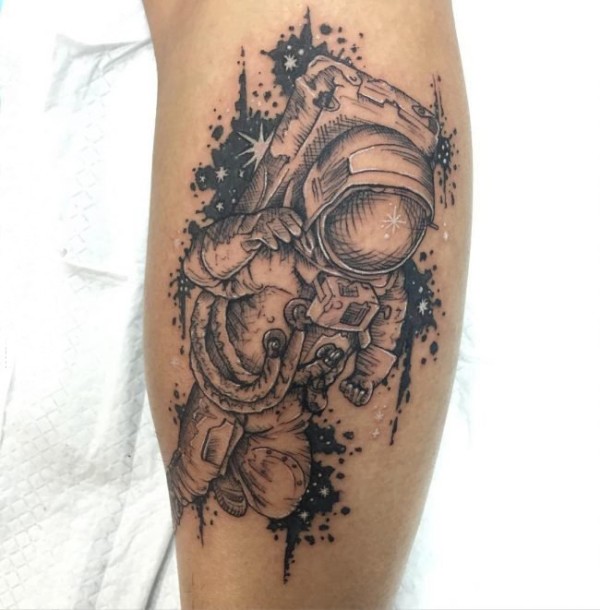 男生手臂上黑灰素描点刺技巧创意宇航员纹身图片