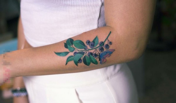 女生手臂上彩绘清新植物与蝴蝶纹身图片