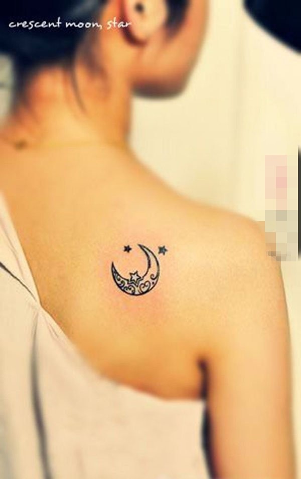 女生后背上黑色简约线条微型月亮与星星清新纹身图片