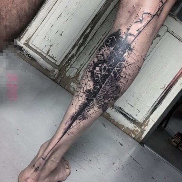 男生小腿上黑色几何元素简单线条组合图形纹身图片