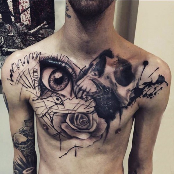 男生胸口黑灰素描创意眼睛花朵纹身图片