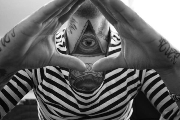 男生脖子上黑灰色几何线条眼睛纹身图片