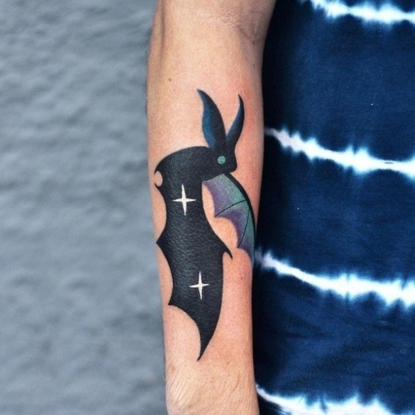 男生手臂上彩绘渐变小动物轮廓蝙蝠纹身图片