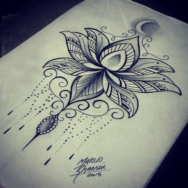 纯洁无暇的黑色抽象线条植物莲花纹身手稿