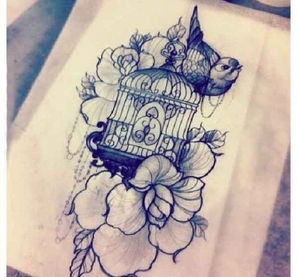黑色简单线条植物花朵和小动物小鸟纹身手稿