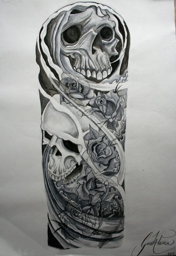 黑灰素描创意骷髅花朵花臂纹身手稿