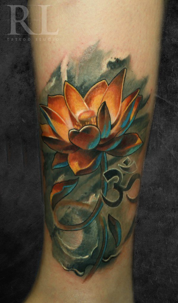 女生小腿上彩绘植物创意佛教莲花纹身图片
