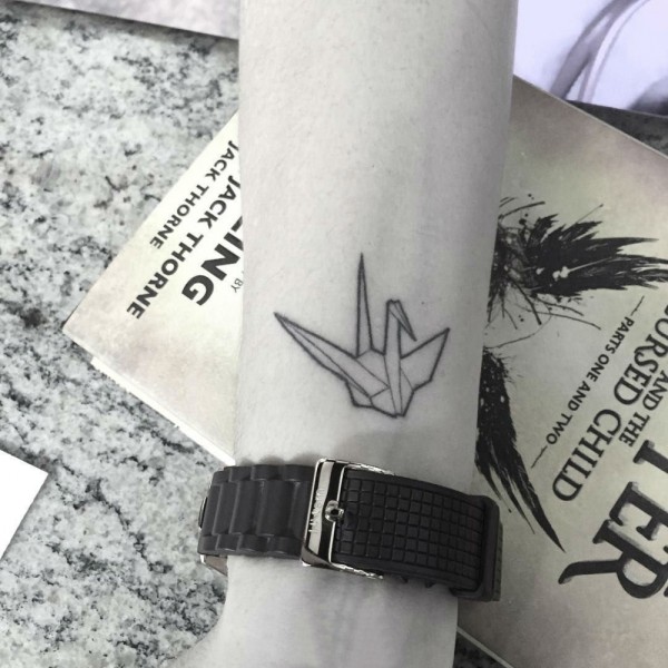 女生手腕上黑色几何线条千纸鹤纹身图片