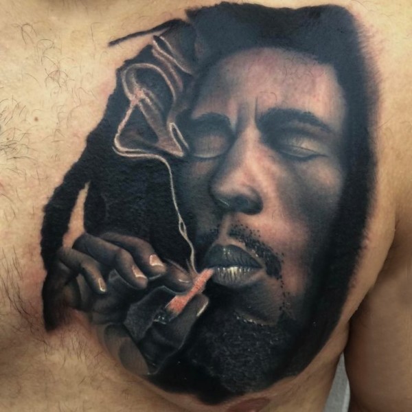 男生胸部黑色点刺人物肖像和烟雾纹身图片