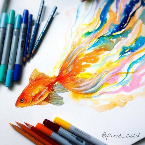 彩绘水彩创意抽象七彩水墨金鱼纹身手稿