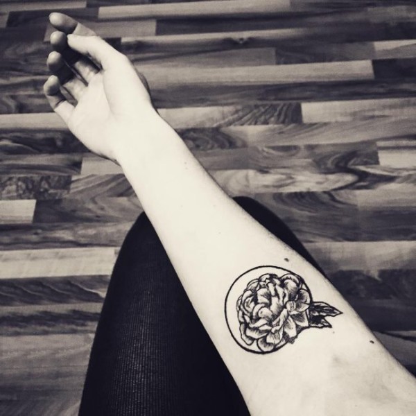 女生手臂上黑色点刺几何线条植物花朵纹身图片