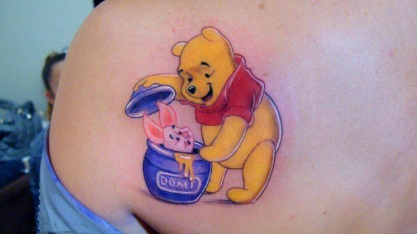 女生肩部彩绘线条卡通人物小熊维尼纹身图片